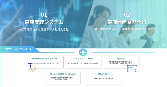 月額100円/人~という低コストで健康管理システム+健康診断業務代行サービスをセットで提供しています。2つをセットで提供することにより、企業の健康管理に係る業務負担を大幅に軽減。健康経営優良法人認定取得に向けた取り組みにもご活用いただけます。さらに、ストレスチェック代行や健診データ入力代行、健康分析レポートなど、オプションサービスも充実。各企業様に合わせてオプションを組み合わせ、貴社だけのプランを提供が可能です。