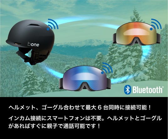 bone TALKYはboneスノーゴーグルと互換性があり、ペアリングすれば最大700mの距離で会話が可能 になります。音声は遅延なく相手に届き、滑走中も常に会話ができるのでお子様と滑る時もより安心。 最大6台同時に接続可能でヘルメット1台とゴーグル2台、ヘルメット2台とゴーグル1台、ヘルメット2 台のみなど接続の組み合わせは自由です。インカム接続にはスマートフォンは必要ありません!