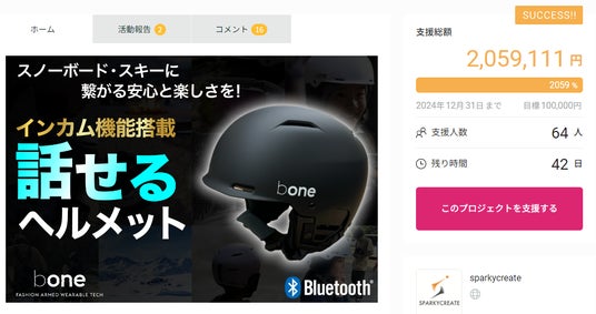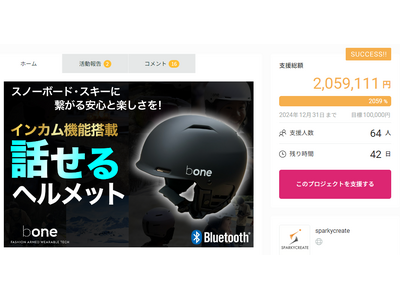 スパーキークリエイト株式会社(本社:東京都足立区、代表取締役:成田 光 以下 スパーキークリエイト) は、bONE Technology社 日本総代理店として、2024年11月14日より国内クラウドファンディングサービス「GREEN FUNDING」にて開催中の、世界初となるBluetoothインカム通話機能を搭載したジュニア用スノーヘルメット「bone TALKY」のプロジェクトにて目標金額を早期達成しました。