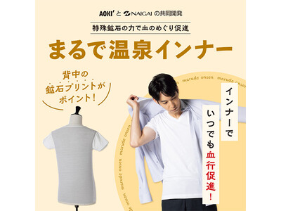 株式会社AOKI(代表取締役社長:森裕隆)は、プリントされた鉱石が放つ遠赤外線の力で血行を促進する効果が期待できる、株式会社ナイガイ(代表取締役社長:今泉賢治)との共同開発『まるで温泉』シリーズから、新たにメンズ肌着の販売を開始いたしました。