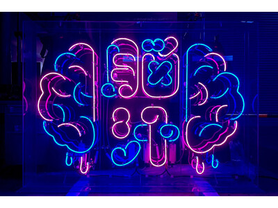 館内に入った瞬間に目に飛び込んでくるのは、右脳と左脳から「脳汁」が飛び出す、横幅1.7mのネオンアート。制作は、人気イベント「大ネオン展」を主催する「アオイネオン」。本物のネオン管を職人の手でつくりあげた作品で、光を浴びて「ネオン浴」を楽しんだり、記念撮影を楽しむことができます。