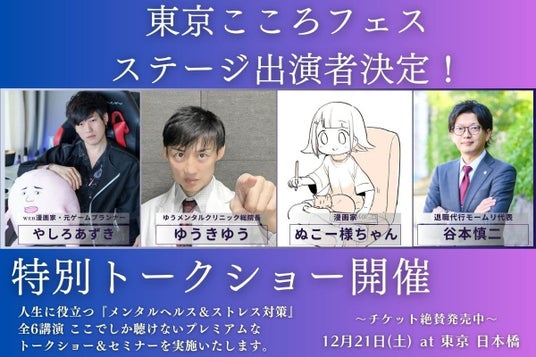医療法人社団上桜会 精神科心療内科ゆうメンタルクリニック(全国12院にクリニック展開)が監修し、「疲れたこころとからだを癒す。」「メンタルケアをより日常に。」「メンタル不調についてより理解を。」目的にしたオフラインイベント『東京こころフェス』を東京日本橋 プラザマームにて開催いたします。当イベントは3つのメインコンテンツで構成され、来場者は一日でメンタルヘルスについて学び、今後の自身のメンタルケアに活用できる知識&グッズを入手することができます。