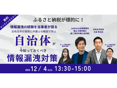 国内導入実績No.1※1の不正検知サービスを提供し、安全なネット通販のインフラづくりに貢献するかっこ株式会社(本社:東京都港区、代表取締役社長:岩井 裕之、証券コード:4166、以下 Cacco)は、弁護士法人Authense法律事務所(本社:東京都港区、代表弁護士:元榮太一郎、以下Authense法律事務所)、過去にクレジットカード情報漏洩を経験され、現在は安心安全なふるさと納税運用に取り組む志布志市役所(市長:下平 晴行、以下 志布志市)と、自治体における情報漏洩対策を学べる「ふるさと納税も標的に!自治体が今知っておくべき情報漏洩対策セミナー」を2024年12月4日(水)に開催することをお知らせします。
