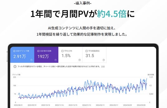 AI技術で1記事4,980円(※月2記事~)という価格を実現。それでも品質には妥協しません。月々たった9,960円から始められる「成果重視のSEO」。
