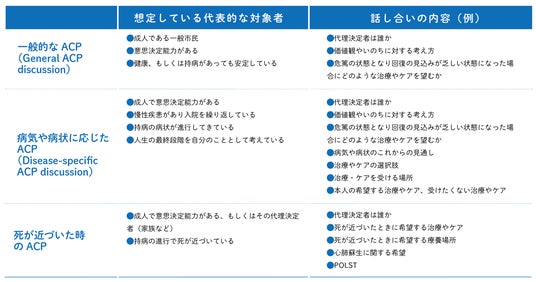 「病気や病状に応じたACP」は余命が1年程度と予測されるタイミングが推奨されており、早すぎるとメリットよりもデメリットの方が大きいとされています。ただしACPには下記のように3種類あり、健康な人または安定している人を対象とした「一般的なACP」は、ライフイベントに合わせて実施することが推奨されています。どの段階のACPでも、話し合うべき内容に含まれているのが「代理決定者は誰か」という項目です。自らの価値観、死生観を共有しておくべき人を誰にするのかは、健康な人から死が近づいてきた人まで、全ての人があらかじめ決めておきたい点です。