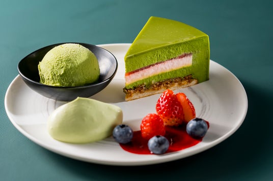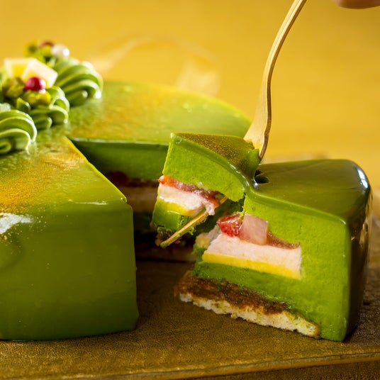 見た目と味わいで「抹茶感」を楽しむいくつもの素材の層を重ねて中身にこだわり、美しい断面と一口食べた時の感動を追い求めました。 滑らかな抹茶ムースの味わいはもちろん、苺ムースや柚子とパッションフルーツのクリームなど、抹茶とそのほかの素材との組み合わせも楽しめる、全7層の贅沢なケーキとなっています。