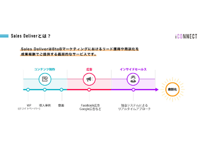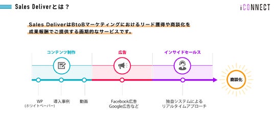 BtoBマーケティング支援事業をおこなう株式会社アイコネクト(本社:東京都目黒区、代表取締役社長:広沢祐介)はこの度、BtoBマーケティングにおけるリード獲得や商談化を成果報酬でご提供する画期的なサービス「Sales Deliver」の提供を開始いたします。