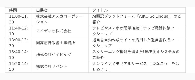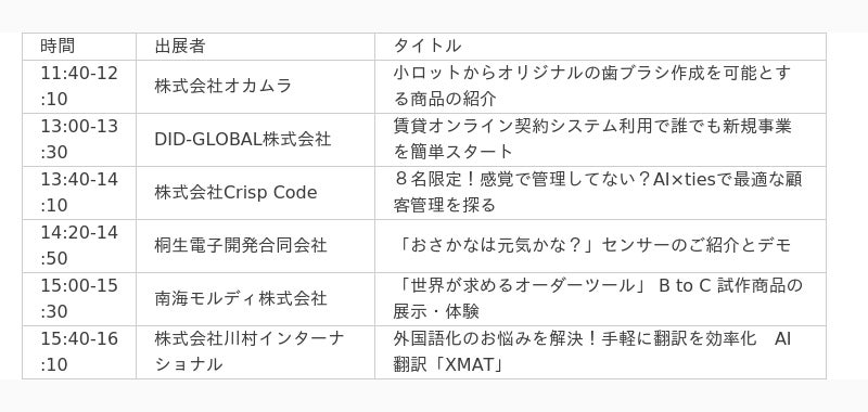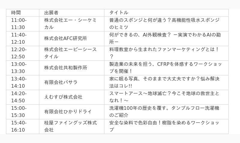 今回初開催するワークショップは、「ブース展示では説明しきれない製品やサービスの特徴を伝えたい」という出展企業の要望と「実際に試してみたい」という来場者の希望から実現。全19社が、各社30分の一度限りのワークショップを開催します。