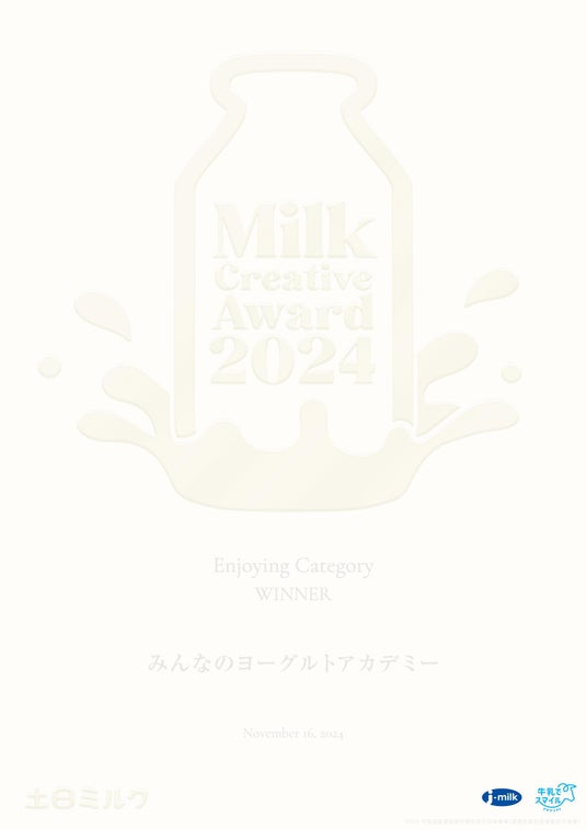 Jミルクは、「学校給食がない日も牛乳を飲もう」をテーマに、小中学生の子どもとその保護者を主な対象として取り組む「土日ミルク」の一環として、牛乳・乳製品の新しい楽しみ方をより多くの方に知っていただくため、1000人以上の酪農乳業関係者やミルクファンによる投票で「Milk Creative Award by 土日ミルク」を実施しました。2024年11月16日(土)に最優秀賞を決定し、東京・豊洲で開催し約3万人が来場した『ワクワク・ゴクゴク・パクパク 土日ミルクフェス2024』で発表いたしました。
