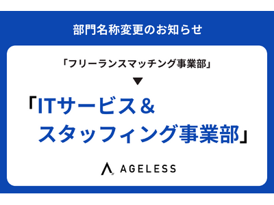 株式会社エイジレス(本社:東京都目黒区、代表取締役:小出 孝雄、以下当社)は、2024年11月より主力事業「エイジレスフリーランス」の部門名称を、「フリーランスマッチング事業部」から「ITサービス&スタッフィング事業部」へと変更いたしました。尚、サービス名称は「エイジレスフリーランス」を継続してまいります。