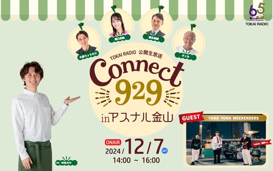 その他、12月7日(土)には、ゲストにYONA YONA WEEKENDERSのVo&Gt. 磯野くんを迎え、公開生放送「Connect929 in アスナル金山」をお届けします。12月8日(日)深夜には、落語とともに心地よいジャズのナンバーをミックスした「なごやか寄席 with urban jazz night」をお楽しみいただけます。ラジオっていいね!とTOKAI RADIOを初めて聞く方にもお楽しみいただける2週間となります。各ワイド番組での企画内容や特番などの詳細は、放送内で告知するほか、TOKAI RADIOのウェブサイトに掲載されます。