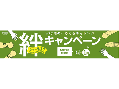 イオンペットでは、2013年より、地域のお客さまやご協力いただく各ペットフードメーカーさまと共に、動物愛護への理解と関心を深めることを目的に、『絆キャンペーン』を継続的に実施してまいりました。本年は、9月20日(金)~9月26日(木)の動物愛護週間※1に伴い、9月1日(日)~9月30日(月)の期間中、全国のペテモにて、店頭とオンラインストアでお買上いただく商品数、直営グルーミングサロンでのコースご利用件数、直営動物病院でのペットドックご利用件数から換算した総額※2を、ご参画いただくお取引先さまとイオンペットから拠出の上、寄付を行います。