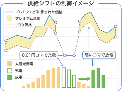 この問題を解決する方法の一つとして、蓄電池を併設し、0.01円となるコマでの発電分は蓄電池に充電を行い、価格の高いコマで放電することで売電収益の向上を図る「供給シフト」が注目されています。