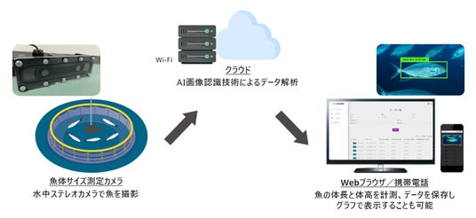 このシステムは、魚体を検出し、位置情報から体長(上顎先端から尾鰭基底まで)と体高(背縁から腹縁まで)を測定します。データはデータベースに保存され、分析や活用が可能です。