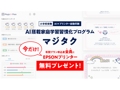 株式会社MagicAlPass(本社:東京都目黒区、代表取締役社長:高木 秀)は、2024年12月1日、AI搭載家庭学習習慣化プログラム「マジタク」がエプソンプリンターを贈呈する特別プラン「365日最後まで伴走プラン」をリリースいたします。