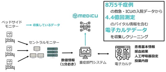 ICU の診療記録は、医療機関ごとに異なる電子カルテシステムに記録されているため、複数の病院のデータを用いた研究を実現することは容易ではありません。“OneICU”は、医師がテキスト入力した病名を自然言語処理の技術で正規化・標準化するだけでなく、薬剤投与や人工呼吸器の使用情報などの構造を統一することで、従来のデータベースでは実現不可能な現実の医療現場に即した AI 開発を実現します。