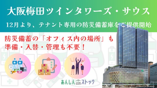 新サービスでは、大阪梅田ツインタワーズ・サウスに入居テナント専用の備蓄倉庫をセットアップし、そこでの防災備蓄品の準備、入替、期限管理等のサービスと安否確認サービスをセットにしたプランを提供いたします。