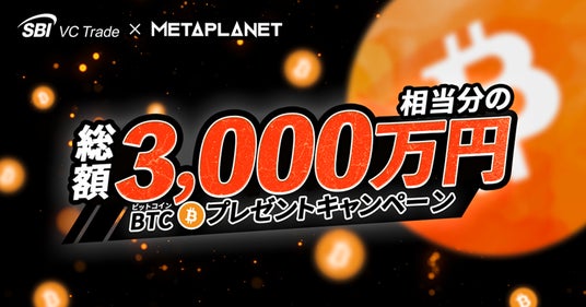 SBIホールディングス株式会社(本社:東京都港区、代表取締役会長兼社長:北尾 吉孝)の連結子会社で暗号資産交換業を営むSBI VCトレード株式会社(本社:東京都港区、代表取締役社長:近藤 智彦、以下「当社」)は、株式会社メタプラネット(本社:東京都港区、代表取締役:サイモン・ゲロヴィッチ、以下「メタプラネット」)と連携し、「【SBI VCトレード×METAPLANET】総額3,000万円相当分のBTCプレゼントキャンペーン」を実施することをお知らせいたします。
