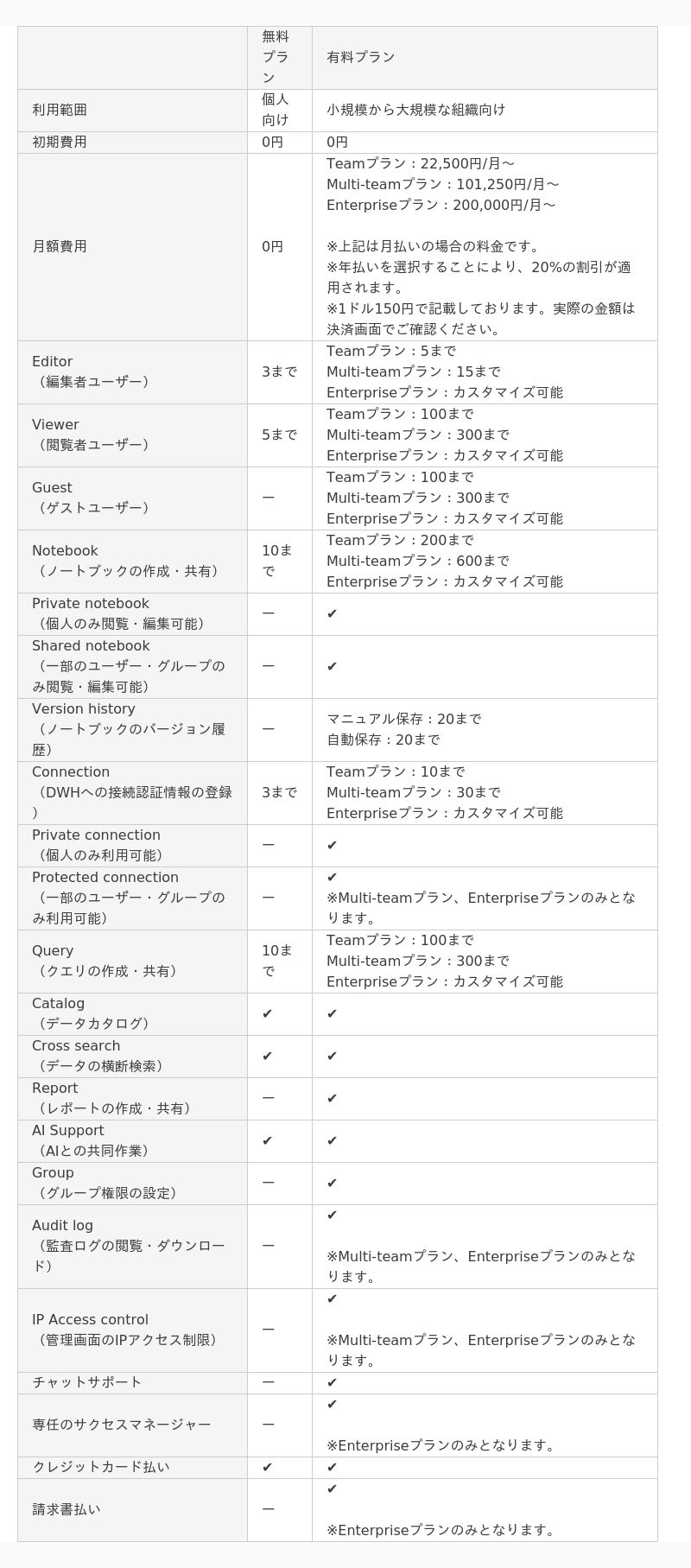 - 一方、有料プランは、小規模から大規模な組織に対応し、詳細な権限管理機能を活用することで、企業の組織構造やポリシーに合った柔軟なデータ管理が実現できます。
