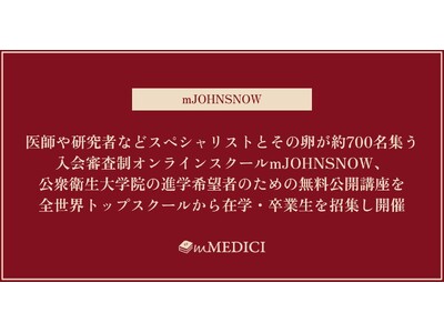 研究者・医療職のスペシャリストによって設立され、一流の知のプラットフォームを提供しているmMEDICI株式会社(代表取締役:廣瀬 直紀、以下「当社」)は、医師や医学研究者などのスペシャリストとその卵が約700名集う日本最大規模のパブリックヘルスオンラインスクールmJOHNSNOWにて、2024年12月20日(金)に、無料公開講座、「n=1で叫ぶ、MPHへの愛と本音~独断と偏見で語るMPH講義~」を開催いたします。
