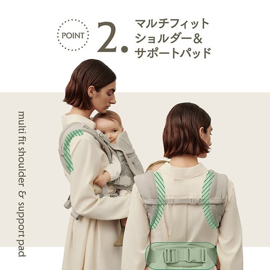 人間工学に基づいた立体構造パターンによる安定感と軽やかな装着感はそのままに、ユーザーの声を反映した新機能を搭載。安全かつ時短で装着できるセーフティーロック機能付きマグネットバックル(※特許申請中)や、肩や腰への負担を大幅に軽減する4レイヤー&サポートパッドを新たに追加。お子さまを素早く、快適に抱っこするための機能をバージョンアップし、もはや”抱っこひも”ではなく”抱っこギア”と呼ぶにふさわしい仕上がりになっています。