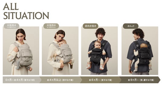 新生児は対面抱っこ、慣れてきたら前向き抱っこやおんぶで。シーンや月齢、気分やシチュエーションに合わせて様々なバリエーションが楽しめます。