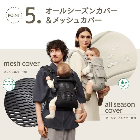 日本の気候に合わせて、通気性に優れたメッシュカバーと、撥水性のあるオールシーズンカバーの2種類を簡単に交換できます。また、体型が異なるママとパパでもスムーズに装着を切り替えられる仕様になっています。