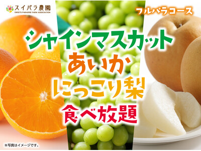 2024年12月11日(水)よりスイーツパラダイスでシャインマスカット食べ放題第4弾「シャインマスカット・あいか・にっこり梨食べ放題」を開催いたします。