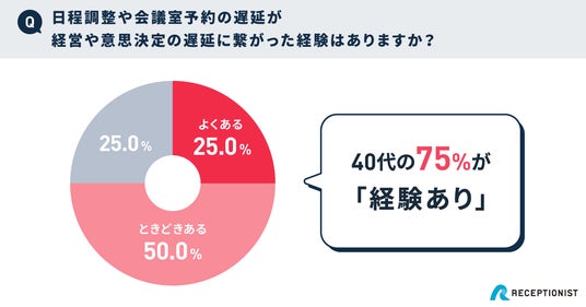 「日程調整、会議室予約の遅延が経営や意思決定の遅延に繋がった経験はありますか。」という問いに対し、40代の75%が「よくある」「ときどきある」と回答しました。