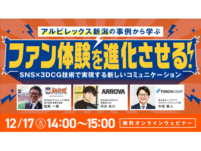 このたび、株式会社トーチライト(本社:東京都渋谷区、代表取締役社長:熊田 聡、以下「トーチライト」)は、株式会社ARROVA(本社:東京都渋谷区、代表取締役社長:荒井 浩介、以下 ARROVA)とJリーグ加盟プロサッカークラブの株式会社アルビレックス新潟(新潟市中央区、代表取締役社長:中野幸夫、以下 アルビレックス新潟)と共催で、「ファン体験を進化させる!SNS×3DCG技術で実現する新しいコミュニケーション」と題した無料オンラインセミナーを2024年12月17日(火)に開催いたします。