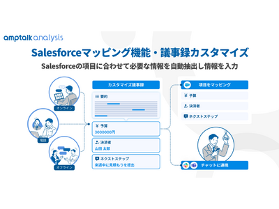 “日本の受注率”を上げるセールスイネーブルメント・カンパニー amptalk株式会社(本社:東京都新宿区、代表取締役社長:猪瀬 竜馬、以下 amptalk)は、電話・商談解析ツール「amptalk analysis(アンプトーク アナリシス)」において、商談議事録の項目を自由にカスタマイズし、Salesforceの項目に紐付け・連携できる「Salesforceマッピング」を2024年12月5日(木)に機能追加しました。
