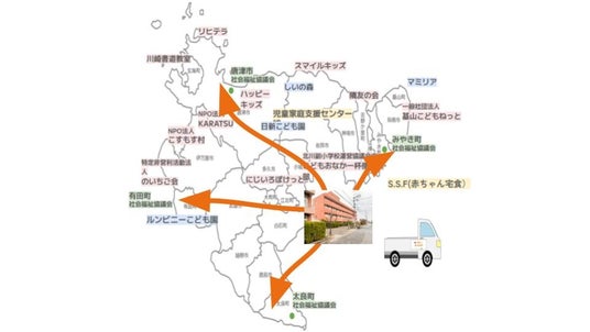 -こども宅食「まんぷくライダー」活動のイメージ 佐賀市のセントラル倉庫から県内各地のこども宅食実施団体の元へお届けします