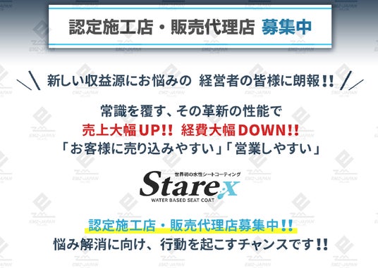 Starexシートコーティングの統括元である株式会社and CLEA(以下、「当事業所」と称します)の渡邊です。現在、当社では長期的かつ、ワンランク上のビジネスパートナーとしてご協力いただける事業者様を募集しております。募集は以下の2種類の形態となります。Starexシートコーティングを【BtoB販売できる販売代理店】およびBtoCでStarex【シートコーティングの施工ができる認定施工店】です。Starexシートコーティングは、エンドユーザーの愛車を守りその価値を高め、また、カーディテイリング業界の活性化に貢献すると自信を持ってお勧めできる商品です。お客様に喜びと安心を体感いただけることで、高いリピート率の信頼関係を構築いただければ幸いです。今回の募集にあたり、公式HPにて「商材の概要と強み」を解説した上で、新規事業での優位性などをご案内しております。