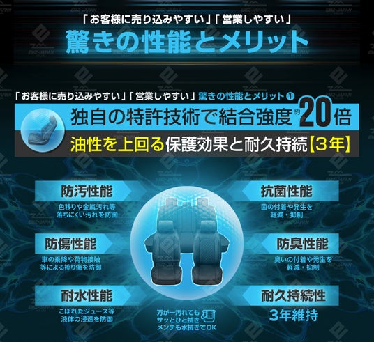しかし、この特許技術により結合強度を通常の「約20倍」に高めることが可能となりました。本革・合皮・ファブリック・アルカンターラと、ほぼ全てのシート素材に対応しており、その性能は従来の水性コート剤はもちろん、油性コート剤とも比較にならないほど優れています。