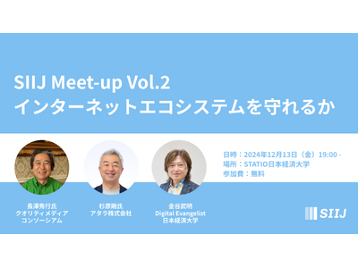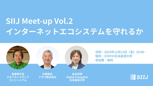 株式会社Digital Evangelist代表の金谷武明が、Sustainable Internet Ecosystem Initiative Japan(以下、SIIJ)が2024年12月13日(金)に開催するイベント、SIIJ Meet-up Vol.2 ~ インターネットエコシステムを守れるか ~に司会者として登壇し、パネルディスカッションのモデレーターなど務めますのでお知らせいたします。