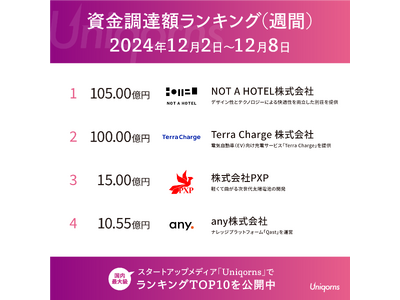 世界的な建築家やクリエイターが手がけるハイエンドな別荘を提供するNOT A HOTEL株式会社と、電気自動車向け充電サービス「Terra Charge」を展開するTerra Charge株式会社が、それぞれ105億円と100億円の大型資金調達を実施。国内最大級のスタートアップメディア「Uniqorns」(運営:株式会社エモリューションクリエイティブ 本社:福岡市、代表取締役:松石 圭介)が発表した2024年12月第1週の資金調達額ランキングでは、次世代太陽電池開発のPXPや、ナレッジプラットフォーム「Qast」を運営するany社なども上位にランクインしました。
