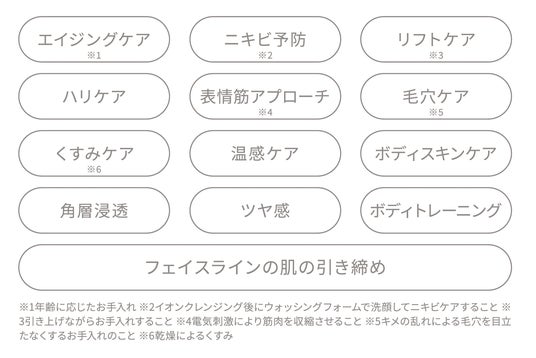 シーズ・ラボではこれまで数々の美顔器を開発してきました。今回「1台13役」という最多機能数を誇る同機種は、まさに「シーズ・ラボ史上最高峰美顔器」と言える仕上がりです。エイジングケアからニキビ予防、ボディトレーニングまで。1台で幅広い悩みにアプローチできます。