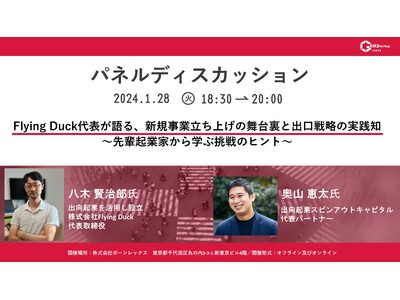 「WakuWaku the World」をミッションに掲げ、挑戦者が挑戦者であり続けられる世界を目指す株式会社ボーンレックス(東京都千代田区、代表取締役 室岡拓也)が東京都より受託し、運営を行っている「新事業発掘プロジェクト事業(GEMStartup TOKYO)(以下、本事業)」では、事業アイデアを持つ挑戦者に対して新事業創出のためのマインドセット、ビジネスモデルの策定支援等を行い、既に事業を推進している挑戦者にはビジネスモデルの深化だけでなく事業会社やVC等とのマッチング機会の提供など事業成長の加速化に向けた支援を実施しております。また、社内環境を整備し挑戦者を支える事務局※の支援まで一気通貫型でトータルサポートを実施いたします。このたび、本事業において『Flying Duck代表が語る、新規事業立ち上げの舞台裏と出口戦略の実践知~先輩起業家から学ぶ挑戦のヒント~』と題し、株式会社Flying Duck代表取締役 八木賢治郎氏と、出向起業に特化したVCを設立した奥山恵太氏をお招きしたパネルディスカッションを開催いたします。