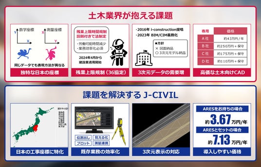 この「ARES(R) Commander」に「J-CIVIL」を組み合わせることで、「AutoCAD(R)」に比べ「同じ操作性を保持しながら土木専用機能が追加されているにも関わらず安価に導入可能」となりました。