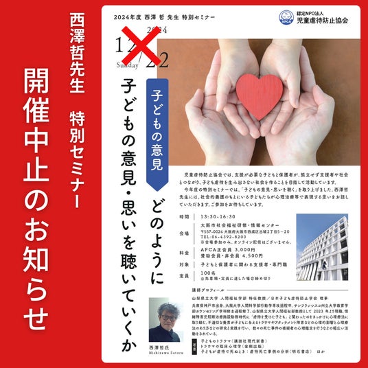 特定非営利活動法人 児童虐待防止協会は、2024年12月22日(日)に「西澤哲先生 特別セミナー」を開催予定でしたが、諸般の事情により開催を中止させていただくことになりました。