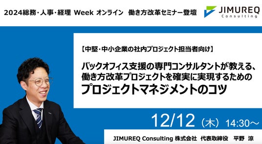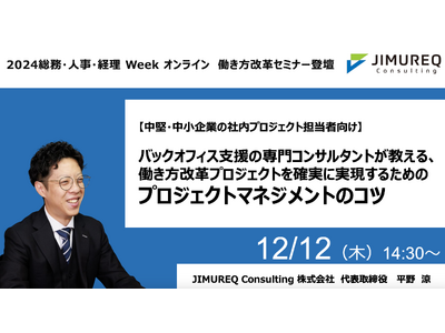 JIMUREQ Consulting株式会社(本社:東京都中央区、代表取締役:平野 涼)は、国内最大級のバックオフィス向けイベント「総務・人事・経理Week」のオンラインセミナーイベントに出展いたします。12月12日(木) 14:30より、中堅・中小企業の社内プロジェクト担当者様向けに、働き方改革プロジェクトを成功させるためのプロジェクトマネジメントのコツをお話いたします。