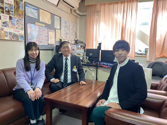 左から加藤教諭、鈴木校長、弊社代表の清水