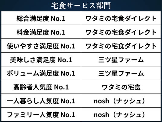 総合の部では、全体満足度、料金、使いやすさでは『ワタミの宅食ダイレクト』。美味しさ、ボリュームでは『三ツ星ファーム』が顧客満足度1位という結果になりました。