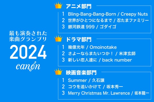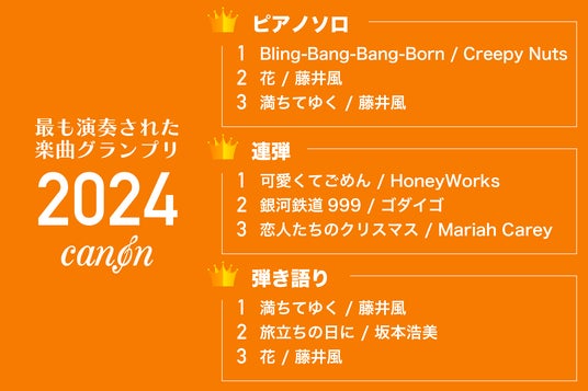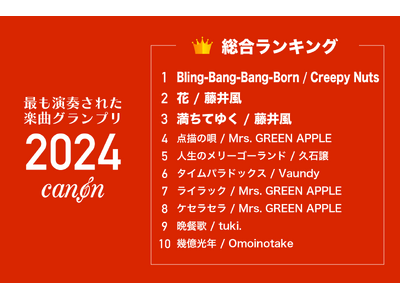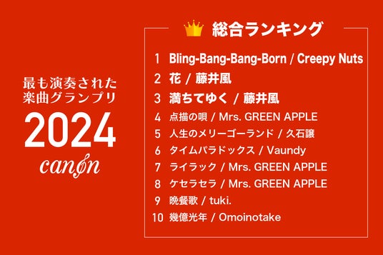 楽譜配信サービス「電子楽譜カノン」を運営する株式会社ファン・タップ(本社:京都市下京区、代表取締役:荒木大輔、以下「当社」)は、今年ダウンロードされた楽譜の調査を実施(調査期間:2024年1月1日~2024年12月10日)、2024年に最も演奏された楽曲ランキングを発表しました。