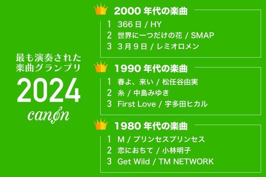 年代別年代別ランキングでは、2000年代はHY「366日」が1位を獲得しました。1990年代は、昨年に引き続いて松任谷由実「春よ、来い」が1位を獲得。1980年代はプリンセス プリンセス「M」が1位を獲得しました。