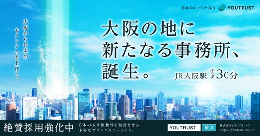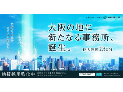 日本のキャリアSNSおよびネットワークリクルーティングサービスの「YOUTRUST」を開発・運営する株式会社YOUTRUST(本社:東京都渋谷区、代表取締役CEO:岩崎由夏)は、西日本地域初の拠点として、大阪事務所を設立したことをお知らせいたします。