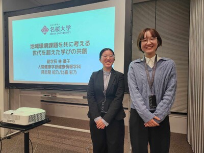 プレゼンテーションを行った本学健康情報学科の比嘉彩乃さん(左)と具志堅妃乃さん(右)