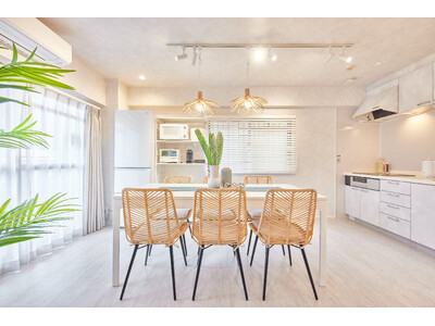 当施設はマンションの最上階にあり、上下2階建てのメゾネットタイプとなっています。施設全体の広さは約106平方メートル 、寝室は合計4部屋あり最大で14名までの宿泊が可能です。マンションの最上階で景色が抜け光がよく入り、施設全体が明るいのが特徴です。内装は白をベースに、特徴的な家具や大振りの観葉植物、アクセントクロスで空間にメリハリを加えました。まるでリゾート地にいるかのような気分で、ゆったりくつろぐ事ができます。