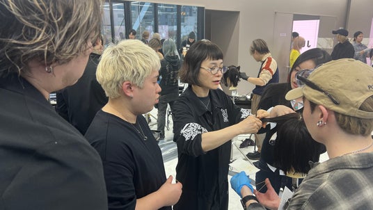 ウィッグを使ったワークセッションの時間で直接指導を受ける参加美容師とInsuk Kim(キム・インスク)氏