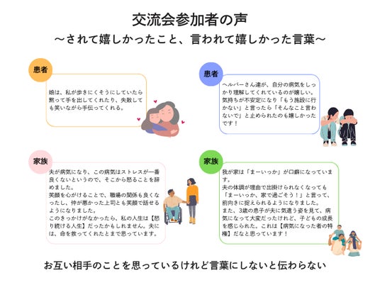 この3つの交流会を開催し、患者と家族(友人・支援者)双方のお話を伺う中で、患者側は、病気や障がいを抱えていることで「ごめんなさい」と言いがちな場面が多いことを実感し、支える側は、患者から「ありがとう」を聞くことで心が軽くなると感じた瞬間を目の当たりにしました。